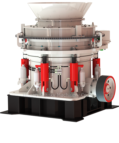 HPS液压圆锥破碎机工作时电动机通过三角皮带、传动轴、伞齿轮副带动偏心套旋转,动锥在偏心套的作用下做旋摆运动使动锥和定锥时而靠近时而偏离。物料在破碎腔内不断受到挤压、冲击而被破碎,破碎的物料从下部排出。