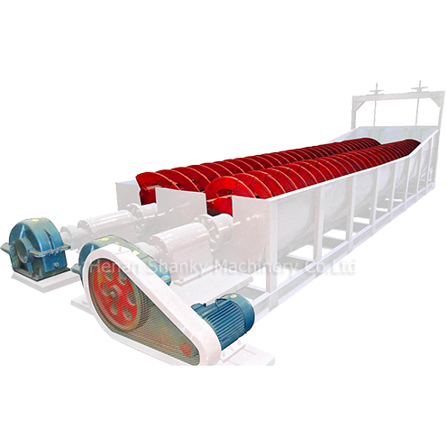 螺旋洗砂机是借助于固体粒大小不同,比重不同,因而在液体中的沉降速度不同的原理,细矿粒浮游在水中成溢流出,粗矿粒沉于槽底。由螺旋推向上部排出,来进行机械分级的一种洗选分级设备。
